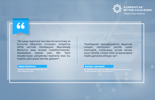 Azərbaycan Beynəlxalq Bankı və bp və onun tərəfdaşlarının - SOCAR, TPAO, PETRONAS, MOL, LUKOİL, NİCO, Equinor, İNPEX, ExxonMobil, SGC, İTOCHU, ONGC, TOTAL, Eni - birgə təqaüd proqramına qəbul başa çatıb. Artıq təlimlərə start verilib. IBA Tech Akademiyasında ödənişsiz təhsili nəzərdə tutan təqaüdü qazanmış tələbələrlə, eləcə də proqrama maraq göstərən digər ictimaiyyət nümayəndələri, media mənsubları ilə Azərbaycan Beynəlxalq Bankının İdarə Heyətinin sədri Abbas İbrahimovun və tərəfdaş şirkətlər adından bp-nin Yaxın Şərq və Xəzər regionunda kommunikasiya və xarici əlaqələr üzrə vitse-prezidenti Bəxtiyar Aslanbəylinin görüşü olub.