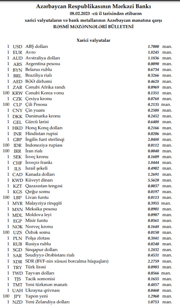 Fins.az xəbər verir ki, 2023-cü il fevralın 8-də ABŞ dollarının məzənnəsi dəyişməyərək 1,7000 manat, avro 1,8245 manat, türk lirəsi isə 0.0903 manat təşkil edib. 1 Rusiya rublu isə 0.0240 manata yüksəlib.