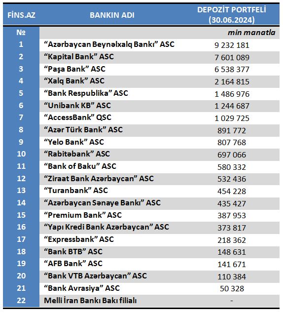 Fins.az 2024-cü ilin 2-ci rübün bankların depozit portfelinin həcminə görə renkinqini təqdim edir: