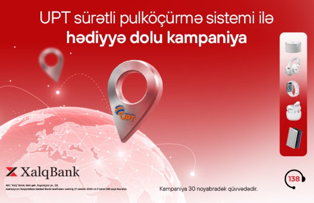 31 noyabradək Xalq Bankın istənilən filialında “UPT” təcili pulköçürmə sistemi vasitəsilə əməliyyat edən hər kəs hədiyyə qazanmaq şansı əldə edəcək.