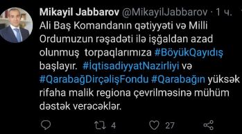 “İqtisadiyyat Nazirliyi və Qarabağ Dirçəliş Fondu Qarabağın yüksək rifaha malik regiona çevrilməsinə mühüm dəstək verəcəklər”, - deyə o, qeyd edib.