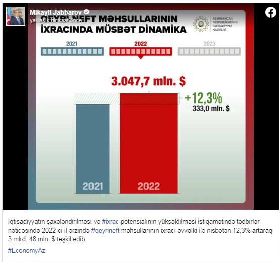Bu sözləri iqtisadiyyat naziri Mikayıl Cabbarov özünün “Facebook” profilində paylaşıb.