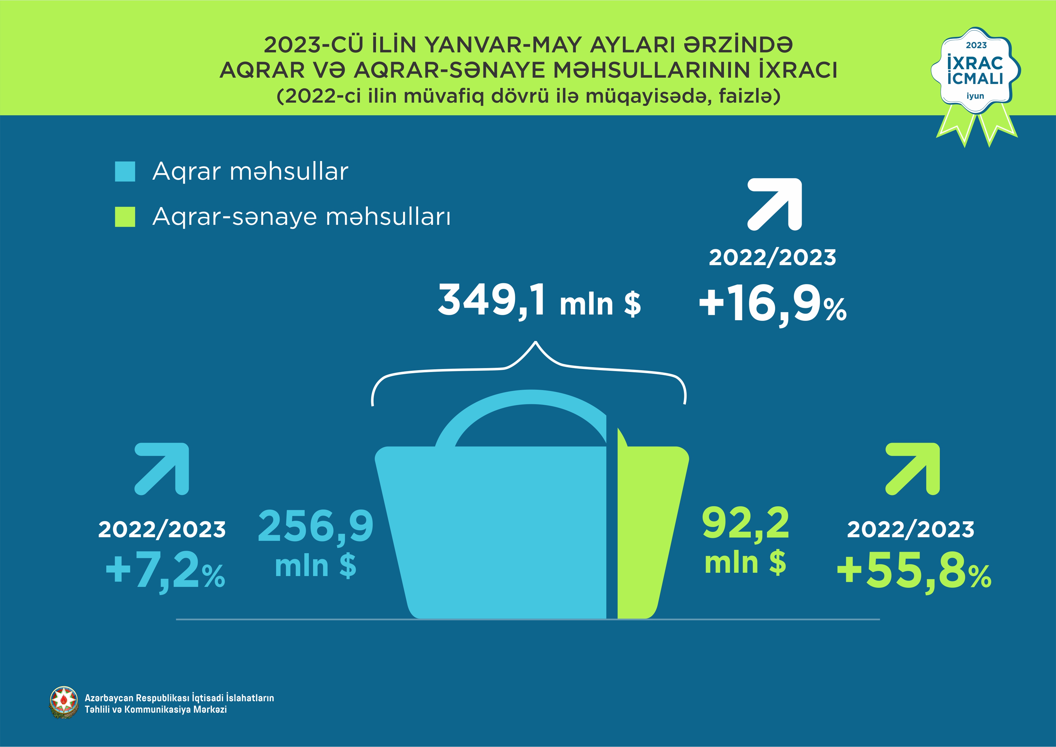 Qeyri-neft-qaz ixracının tərkib hissəsində əhəmiyyətli yer tutan aqrar-sənaye məhsullarının yaratdığı dəyər ötən ilin müvafiq dövrü ilə müqayisədə 55,8% artaraq 92,2 milyon ABŞ dolları təşkil edib. 2023-cü ilin may ayında qeyri-neft ixracı 278,2 milyon ABŞ dolları olub. Bu ilin may ayı ərzində yeyinti məhsulları üzrə ixrac 98,2 milyon ABŞ dollarına, qeyri-yeyinti məhsulları üzrə ixrac isə 180 milyon ABŞ dollarına bərabər olub.