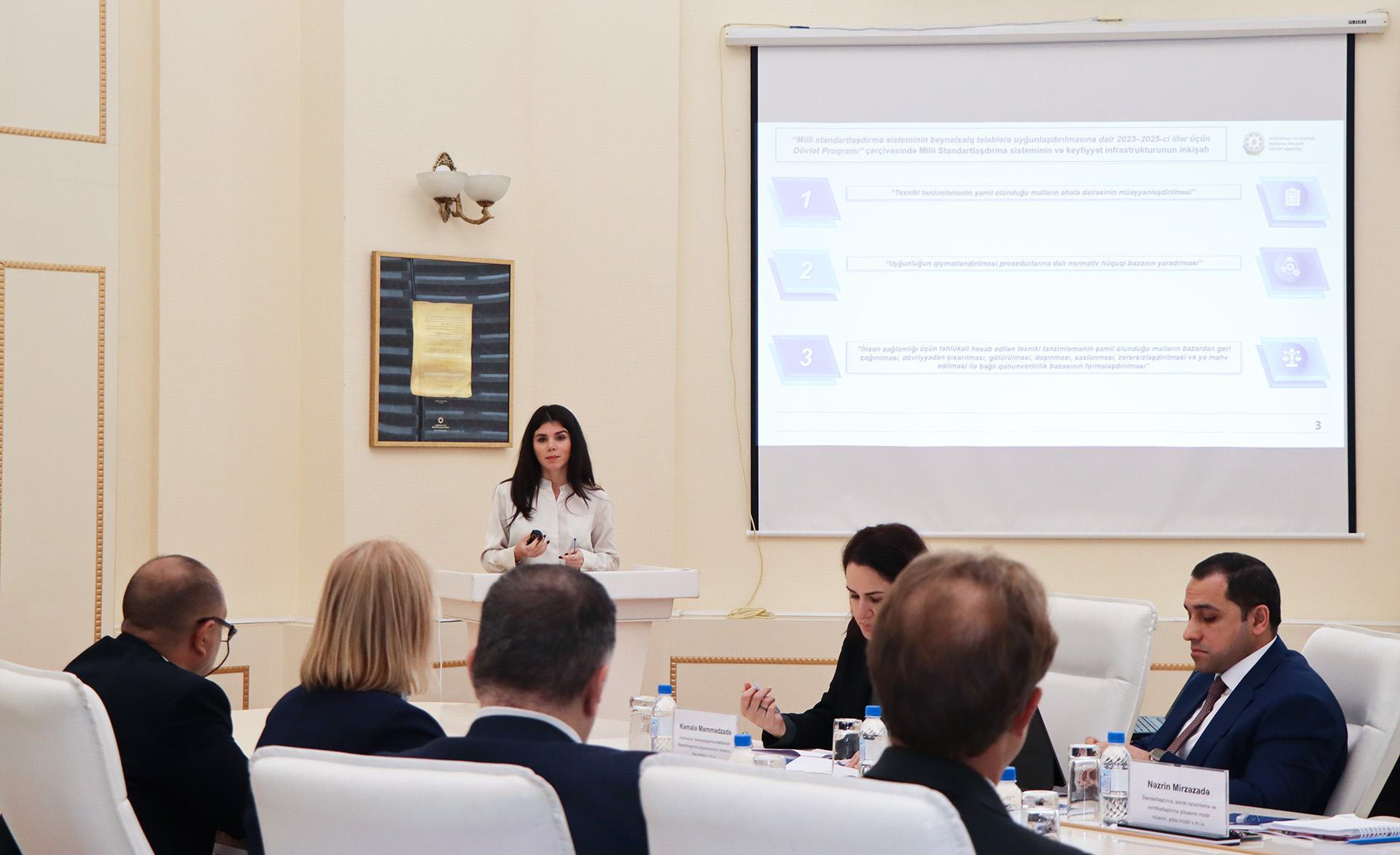 Görüşdə Agentlik sədrinin müşaviri İlqar Həsənov qurumun keyfiyyət infrakstrukturu sahəsindəki fəaliyyət istiqamətləri, görülmüş işlər, əldə olunmuş nəticələr və qarşıya qoyulan hədəflər barədə ətraflı məlumat verib. Eyni zamanda, “Milli standartlaşdırma sisteminin beynəlxalq tələblərə uyğunlaşdırılmasına dair 2023-2025-ci illər üçün Dövlət Proqramı” və onun icrası çərçivəsində görülmüş işlər, qəbul olunmuş normativ hüquqi aktlar, hazırlanmış layihə və hesabatlar, həyata keçirilən tədbirlərin nəticələri və onların iqtisadi təsirləri diqqətə çatdırılıb.