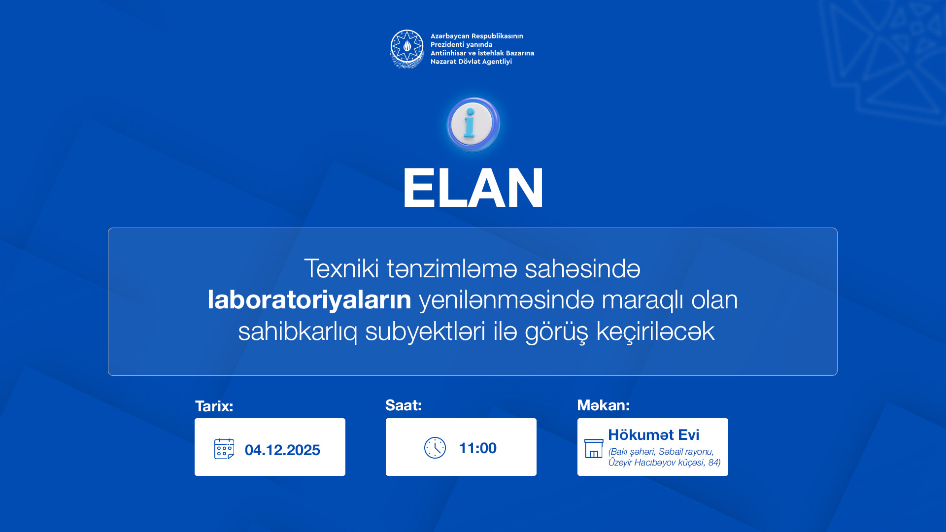 Finss.az - Azərbaycan Respublikasının Prezidenti yanında Antiinhisar və İstehlak Bazarına Nəzarət Dövlət Agentliyi tərəfindən 04 dekabr 2025-ci il, saat 11:00-da texniki tənzimləmənin şamil olunduğu malların tədqiqinin (sınağının) aparılmasını təmin edən laboratoriyaların fəaliyyətinin təkmilləşdirilməsində, o cümlədən yeni laboratoriyaların qurulmasında maraqlı olan sahibkarlıq subyektlərinin nümayəndələri ilə görüş təşkil olunacaq.