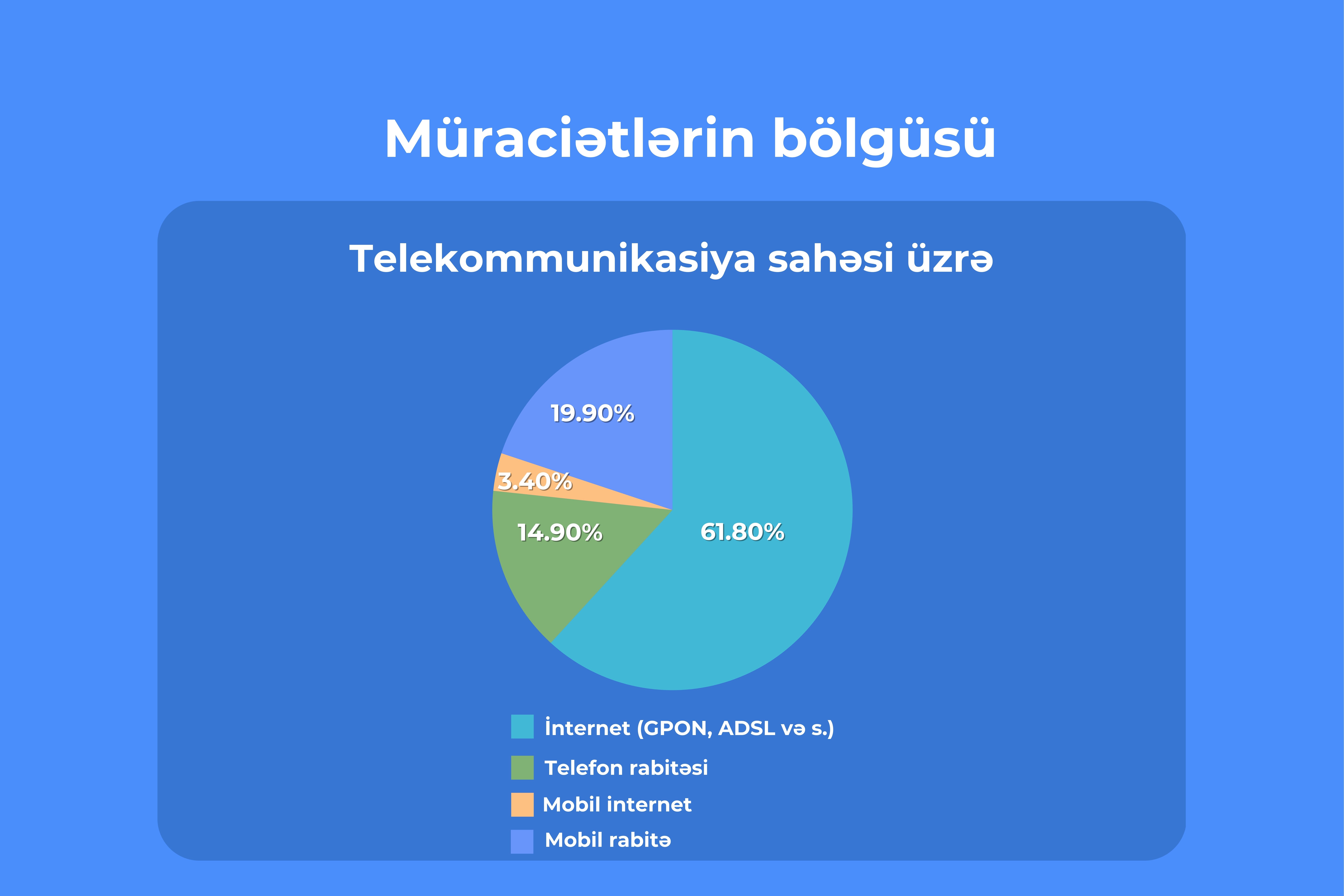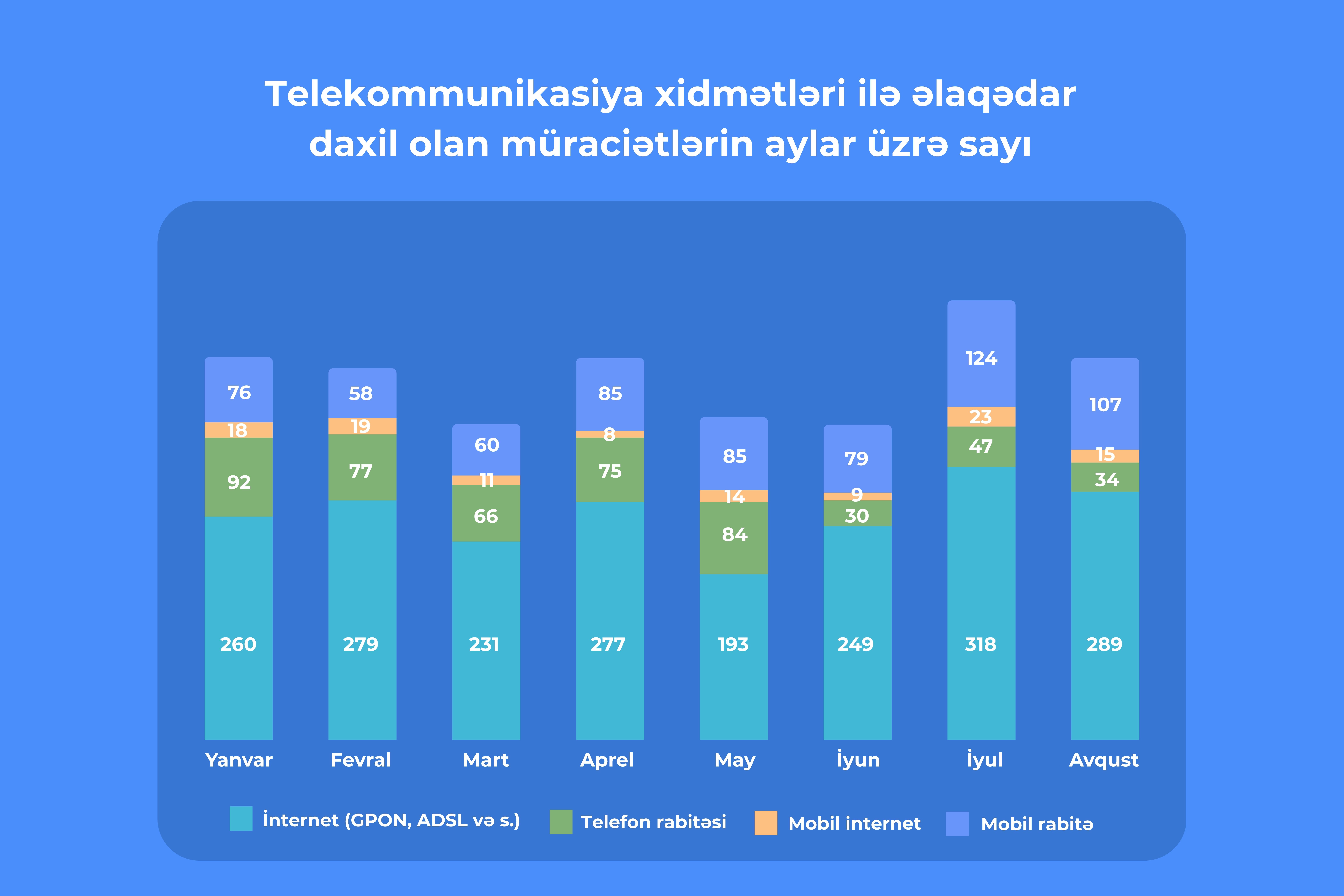 Telekommunikasiya xidmətləri üzrə ilin 8 ayı ərzində “E-Şikayət” sisteminə 3392 müraciət daxil olub. Bu müraciətlərin böyük qismi – 61,8%-i internet (GPON, ADSL və s.) xidmətləri üzrədir. Mobil internet və mobil rabitə üzrə daxil olan müraciətlər 23,3%, telefon rabitəsi üzrə isə 14,9%-dir.
