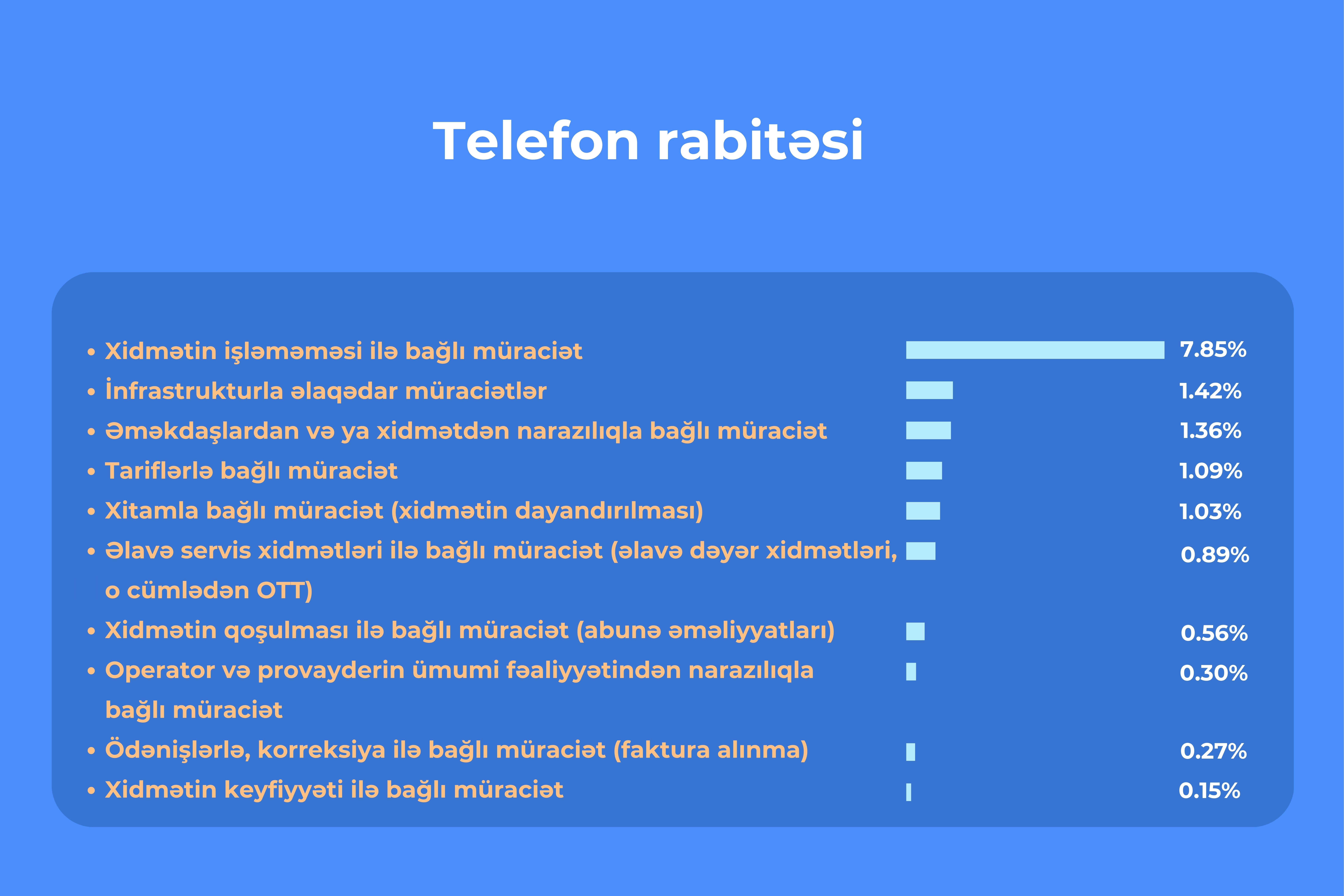 Telefon rabitəsi xidməti üzrə daxil olan müraciətlər xidmətin işləməməsi (7,85%), infrastruktur (1,42%) və istehlakçılara göstərilən xidmətlərdən narazılıqla bağlı (1,36%) əsas kateqoriyalara ayrılıb.