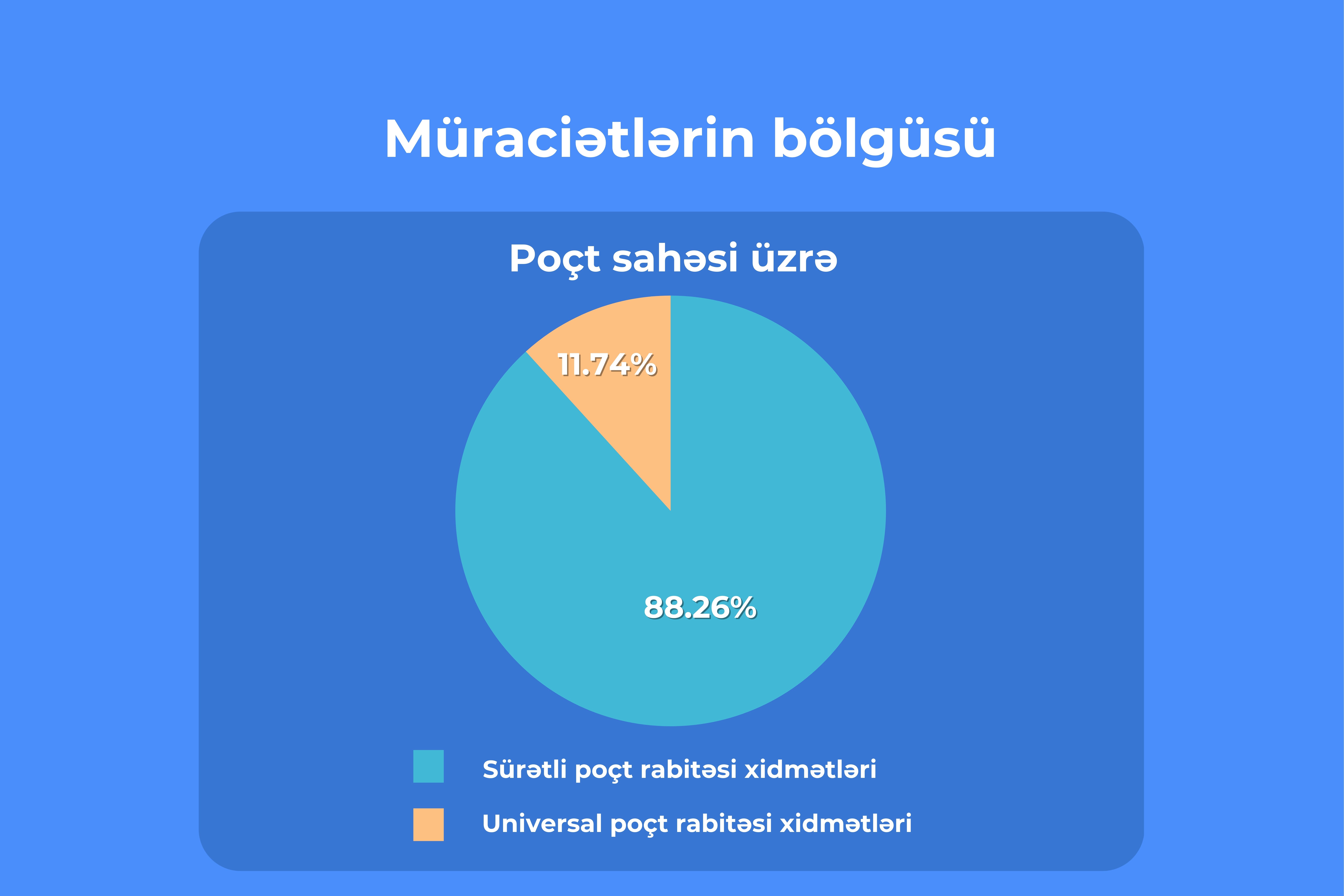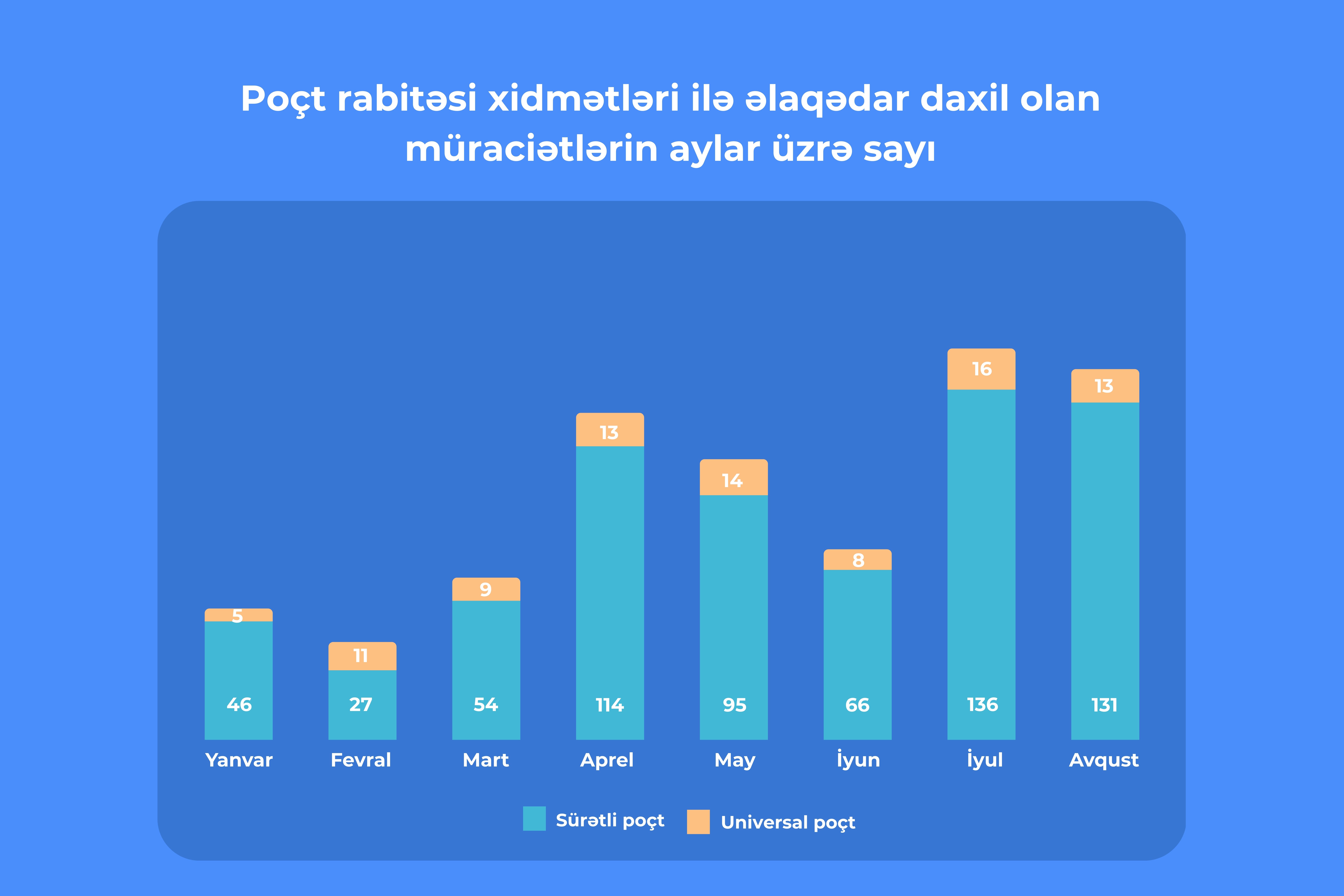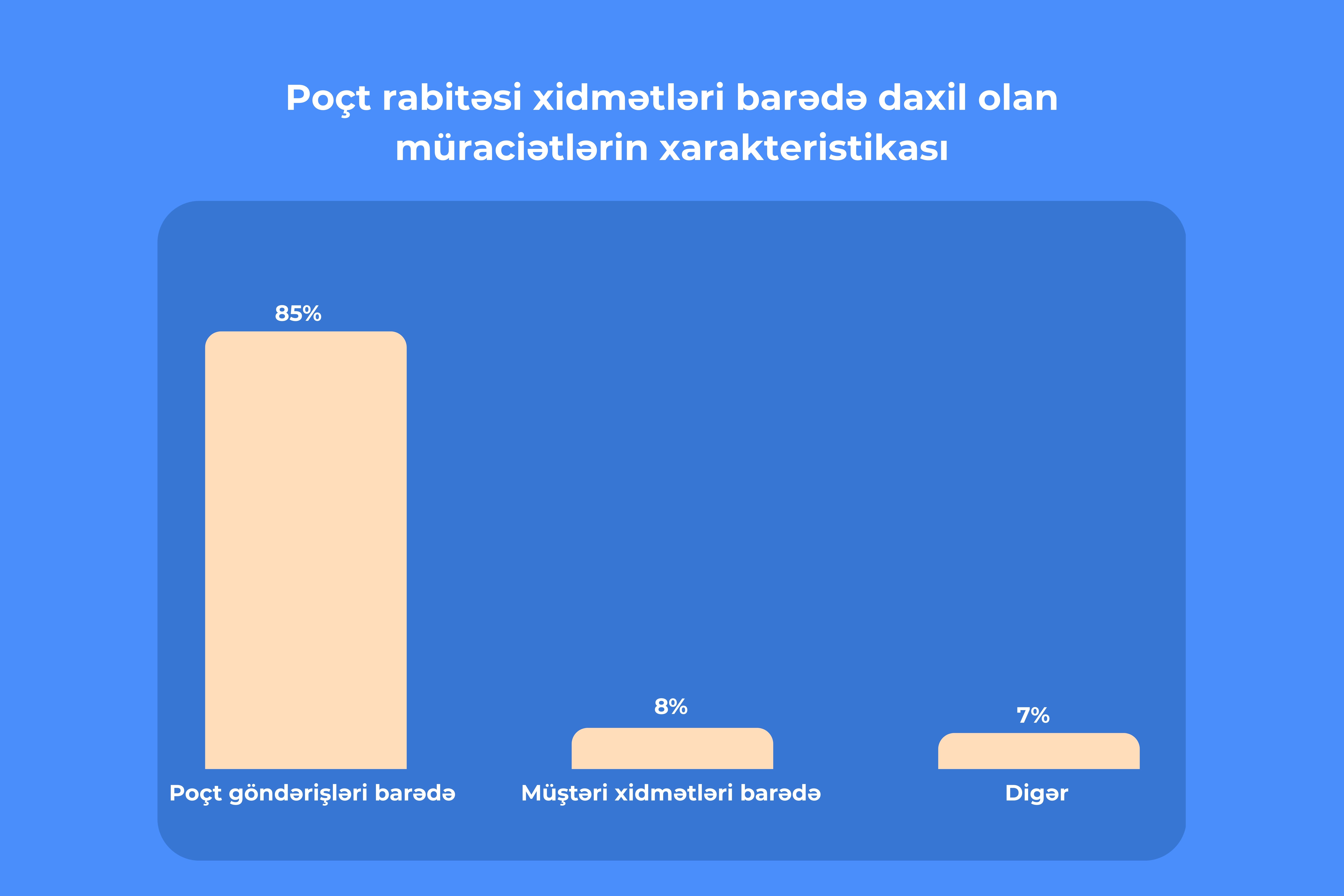 Poçt rabitəsi xidmətləri üzrə 8 ay ərzində 773 müraciət daxil olub. Bu da sistemə daxil olan ümumi şikayətlərin 18,5%-ni əhatə edir. Poçt rabitəsi xidmətlərində müraciətlərin 85%-i poçt göndərişlərinin gecikdirilməsi, çatdırılmaması və ya itirilməsi barədə olub. 8% müraciətlər müştəri xidmətləri, digər 7% isə ödənişlər, poçt rabitəsi operatorunun yerləşdiyi obyektin vəziyyəti, istifadə olunan proqram təminatının işləkliyi barədə qeydə alınıb. Ümumilikdə isə müraciətlərin 88,26%-i sürətli poçt xidmətləri, 11,74%-i universal poçt xidmətləri barədə olub.
