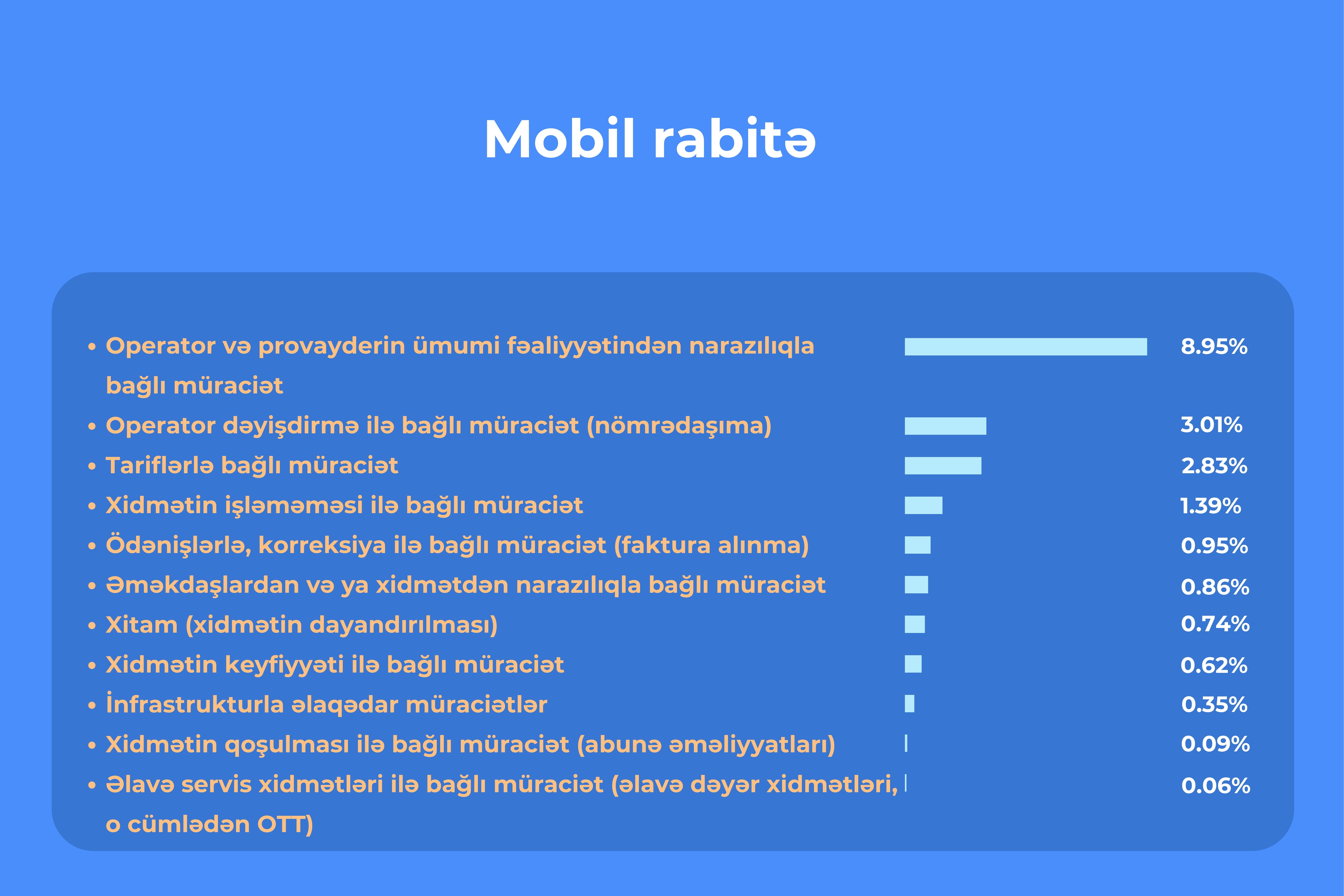 Mobil rabitə xidmətində 8,95%-lə operatorun fəaliyyətindən narazılıq, 3,01%-lə mobil operatorların nömrədaşıma məsələsində abunəçilərə yaratdığı çətinliklər və 1,39%-lə tariflərlə bağlı müraciətlər ilk 3-lüyə daxildir. Operatorun ümumi fəaliyyətindən narazılıq mövzusu əsasən abunəçinin operatorun xidmətindən istifadə edərkən birdən çox çətinlikləri əks etdirir (şəbəkə zəifliyi, danışıqda donmalar, müştəri xidmətlərinin keyfiyyətsiz xidməti, verilən sorğuların gec cavablandırılması və s.).