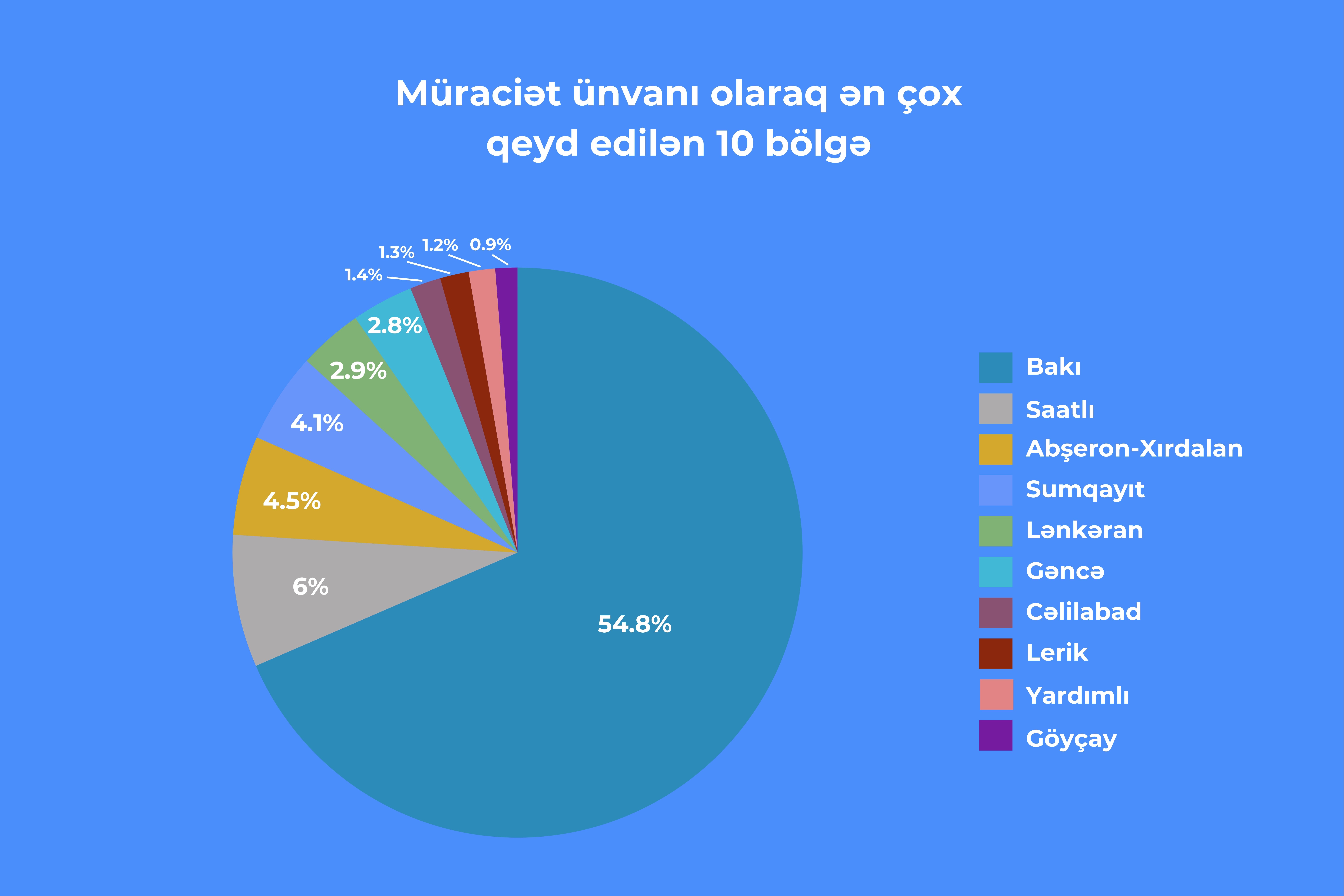 Beləliklə, müraciət edərkən ünvan olaraq vətəndaşların 54,84%-i Bakını, 5,98%-i Saatlını, 4,51%-i Abşeron – Xırdalan ərazilərini seçiblər. Daxil olan müraciətlərin 79,8%-də vətəndaşlar 10 bölgəni (Bakı, Saatlı, Abşeron – Xırdalan, Sumqayıt, Lənkəran, Gəncə, Cəlilabad, Lerik, Yardımlı, Göyçay) ünvan olaraq qeyd ediblər.