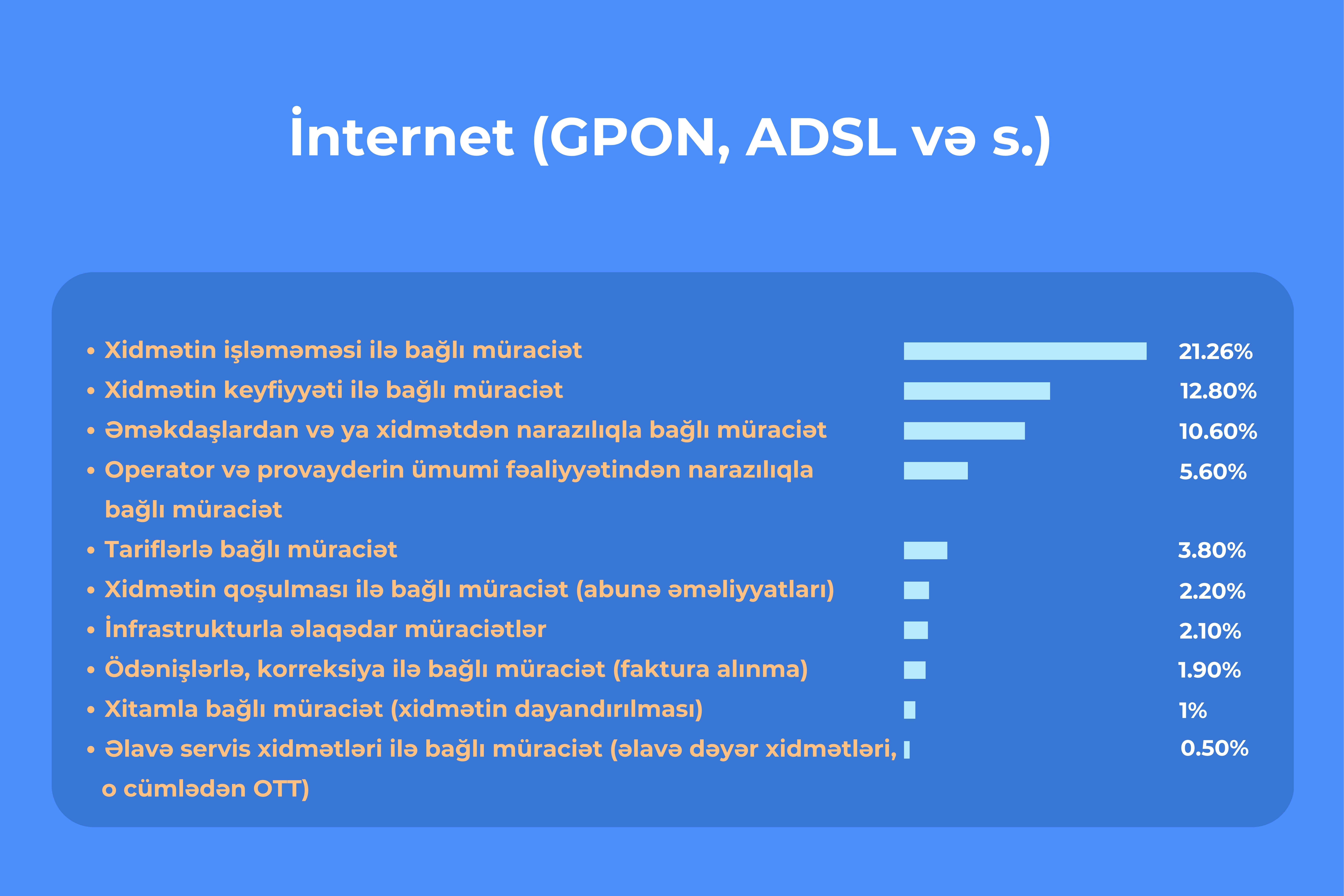 İnternet (GPON, ADSL və s.) xidməti üzrə ilk 2 yeri 34%-lə xidmətin işləməməsi və ya onun keyfiyyəti ilə əlaqədar olan müraciətlər təşkil edir. 3-cü yerdə 10,6%-lə xidmət təchizatçılarının istehlakçılara göstərdikləri xidmətlərlə bağlı müraciətlər əks olunur. Bu kateqoriya əsasən təchizatçıların istehlakçılarla davranışında və ya onların xidmət mərkəzlərində yaranan problemlərlə bağlı şikayətləri əks etdirir.