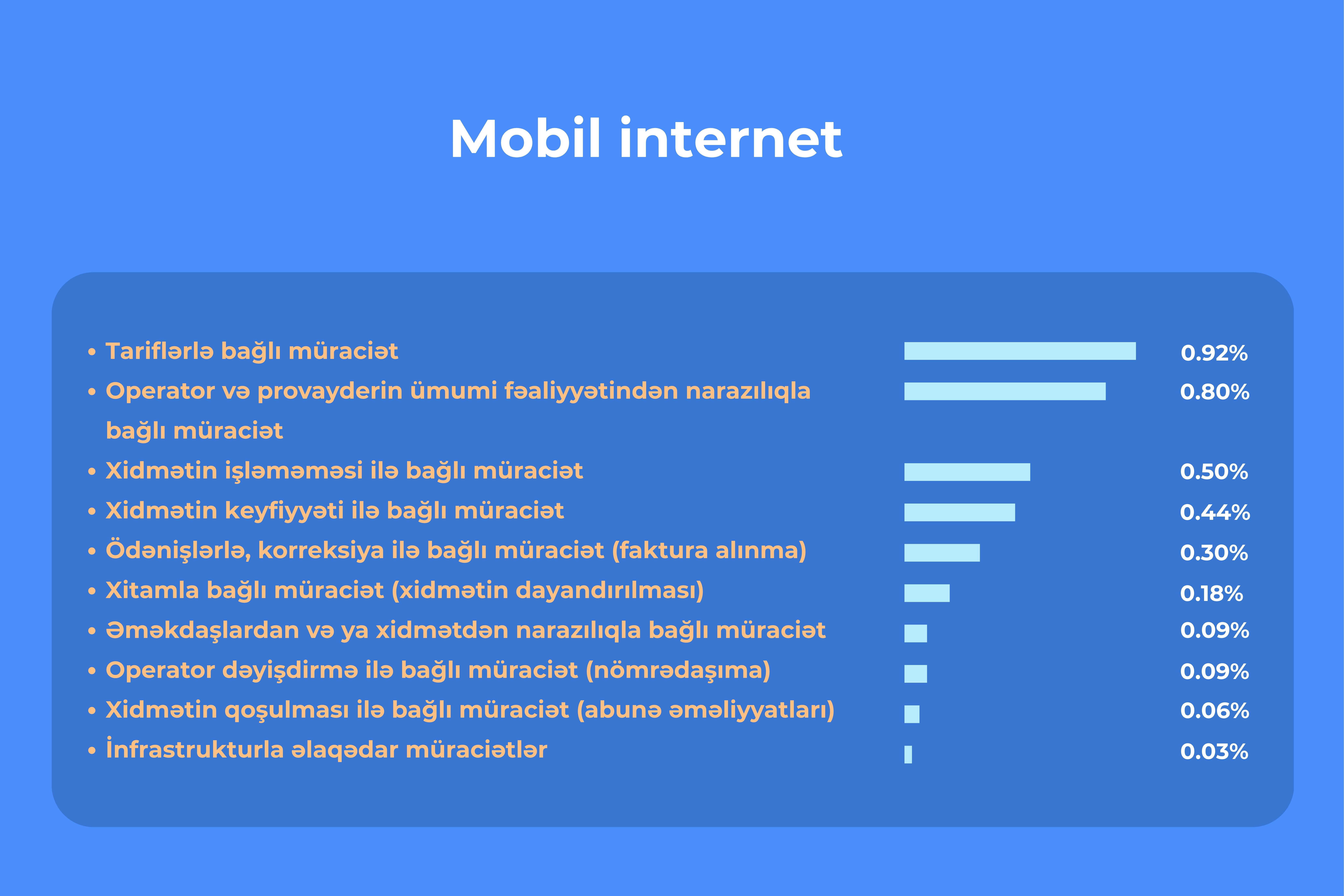 Mobil internet xidmətləri üzrə ən çox müraciətlər 0,92%-lə tariflər, 0,8%-lə operatorun ümumi fəaliyyətindən narazılıq və 0,5%-lə xidmətin işləməməsi barədə qeydə alınıb.