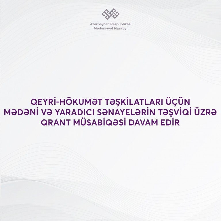 Azərbaycan Respublikası Mədəniyyət Nazirliyinin qeyri-hökumət təşkilatları üçün mədəni və yaradıcı sənayelərin (MYS) təşviqi üzrə 4 iyul 2024-cü il tarixdə elan etdiyi qrant müsabiqəsi davam edir.