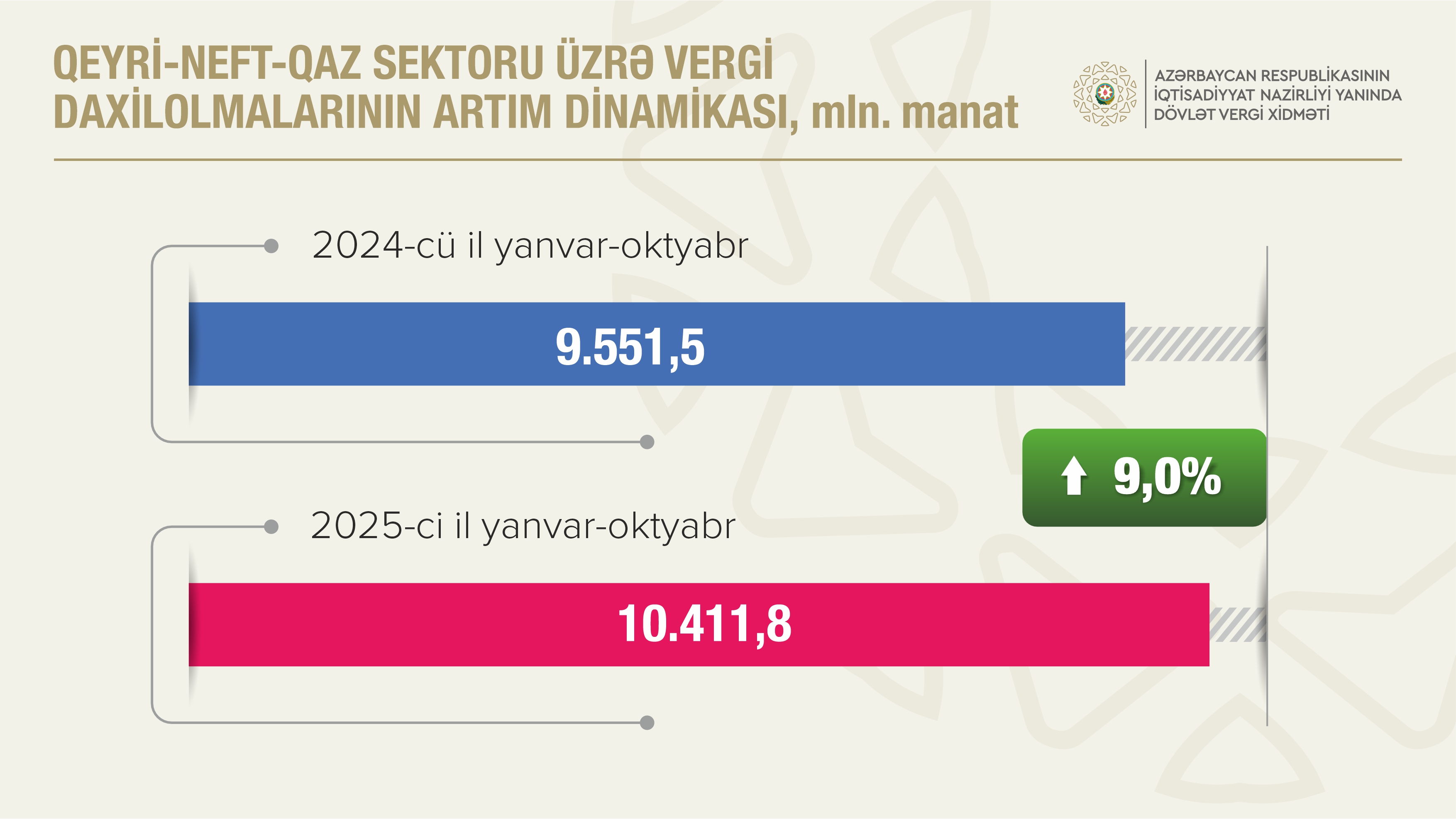 Qeyri-neft-qaz sektorundan daxilolmalar 10 milyard 411,8 milyon manat olub, proqnoz 103,0 faiz icra edilib. Əvvəlki ilin müvafiq dövrü ilə müqayisədə bu sektordan vergi daxilolmaları 860,3 milyon manat və ya 9,0 faiz artıb.