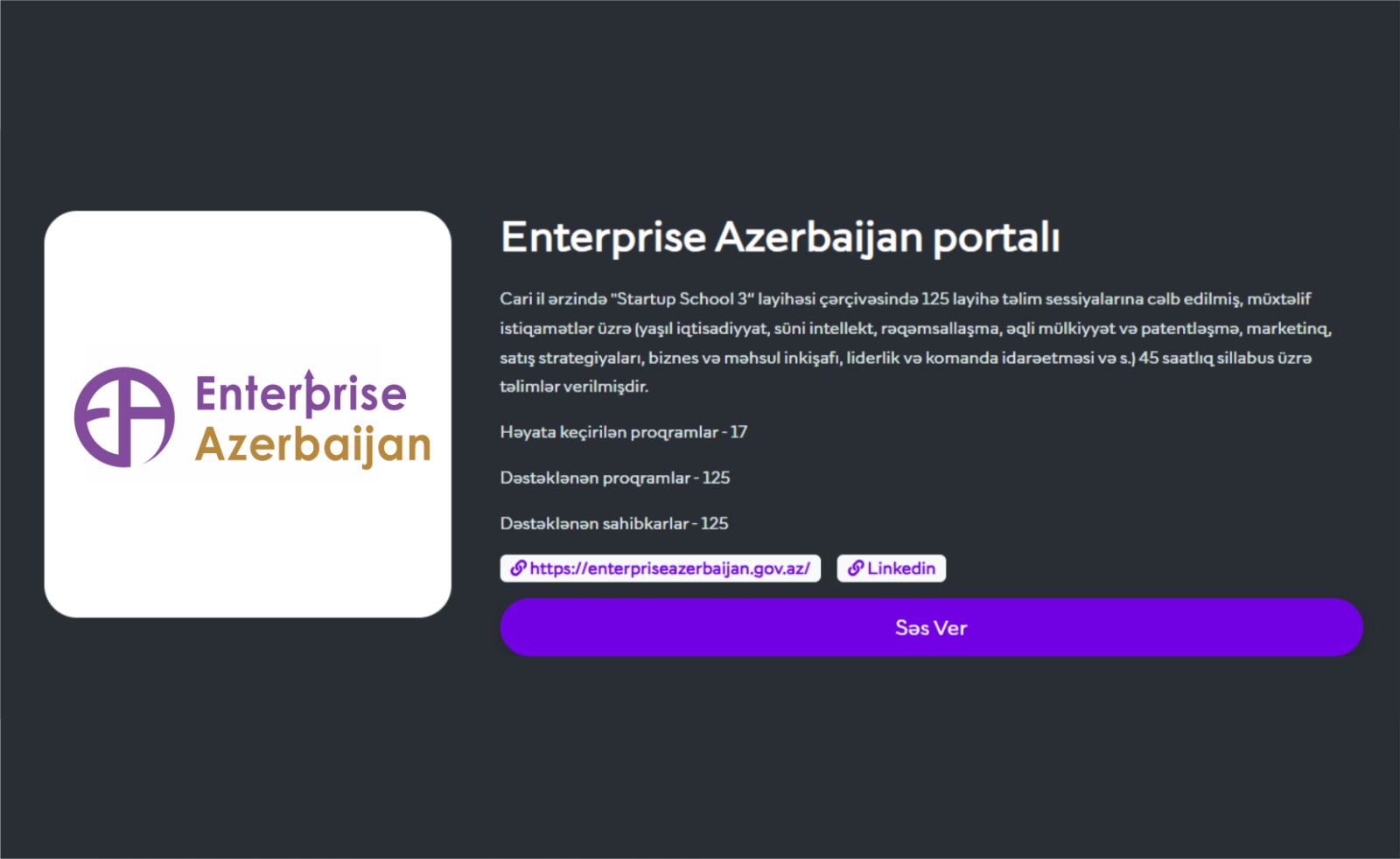 “Enterprise Azerbaijan” portalı innovasiya, sahibkarlıq və rəqəmsal iqtisadiyyat sahəsində həyata keçirdiyi təşəbbüslərlə ekosistemin inkişafına mühüm töhfə verən milli platformadır. Portal innovativ ideyaların reallaşdırılması, startapların və sahibkarların dəstəklənməsi, həmçinin beynəlxalq əməkdaşlıqların genişləndirilməsi istiqamətində fəaliyyət göstərir.