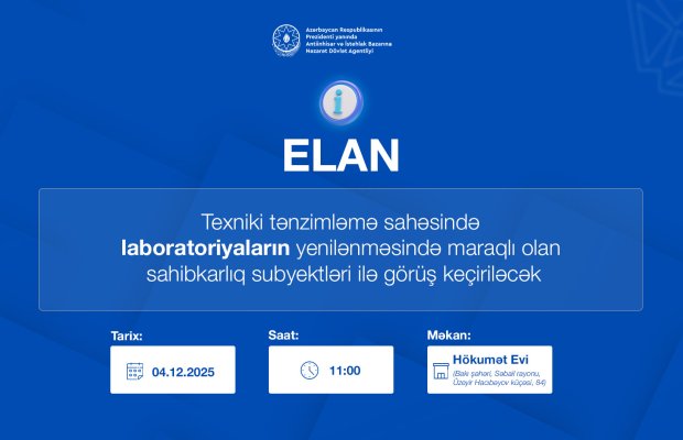Finss.az - Azərbaycan Respublikasının Prezidenti yanında Antiinhisar və İstehlak Bazarına Nəzarət Dövlət Agentliyi tərəfindən 04 dekabr 2025-ci il, saat 11:00-da texniki tənzimləmənin şamil olunduğu malların tədqiqinin (sınağının) aparılmasını təmin edən laboratoriyaların fəaliyyətinin təkmilləşdirilməsində, o cümlədən yeni laboratoriyaların qurulmasında maraqlı olan sahibkarlıq subyektlərinin nümayəndələri ilə görüş təşkil olunacaq.